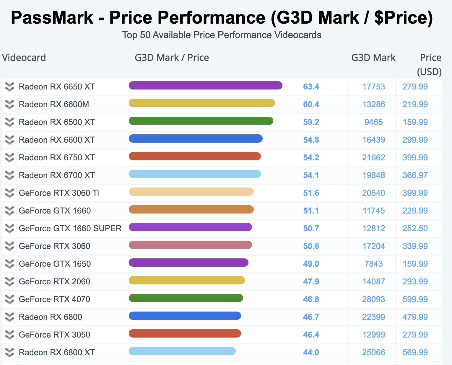 Radeon RX 6650 XT가 가격 279.99달러로 가성비 1위를 차지했습니다. G3DMark 벤치마크 점수는 17753점입니다. 2위는 역시나 amd Radeon 그래픽 카드 6600M입니다.가격 219.99달러 벤치마크 점수 13286입니다.