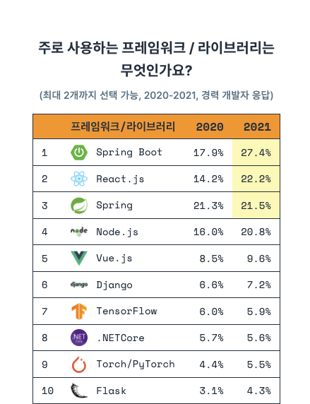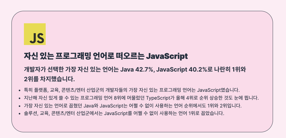 2022 프로그래머스의 설문조사에 따르면 웹 개발에 주로 사용되는 언어인 Java, JavaScript가 나란히 개발자가 자신있는 프로그래밍 언어 순위에 뽑혔습니다. 그만큼 웹 개발의 인력이 많고 수요도 두텁습니다.