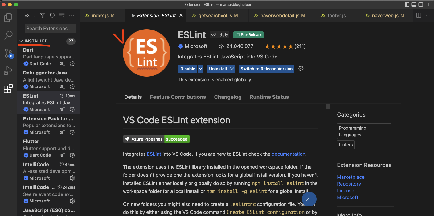 예를 들어서 앱을 만들기 위해 Flutter를 사용한다면 'Dart'를 검색해서 설치하여 사용할 수 있고 코드를 이쁘게 정렬시켜주는 확장라이브러리인 'prettier' 또한 설치할 수 있습니다.