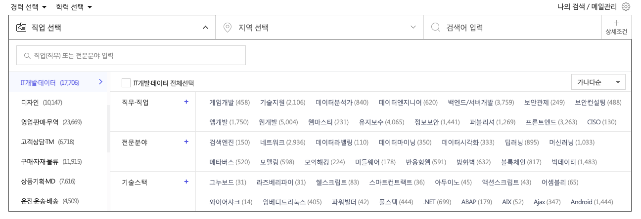사람인 홈페이지에서 IT/서비스 분야의 일자리를 검색해보았습니다. 웹개발이 이미 5000개 이상의 일 자리를 구하고 있고 그 다음으로 유지보수, 그 다음으로 백엔드/ 서버개발 쪽이었습니다.