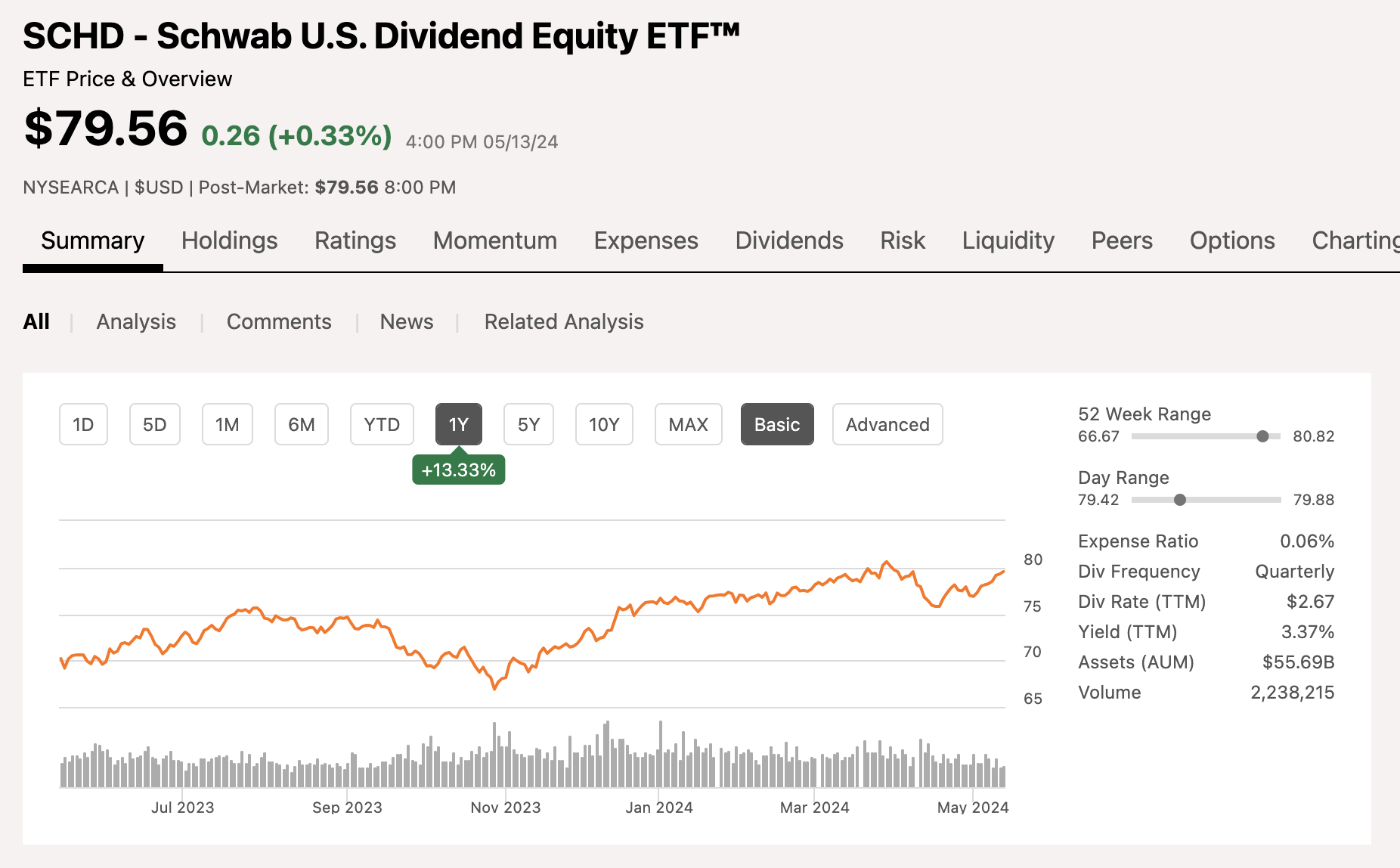 SCHD 는 미국의 배당성장주를 모아놓은 ETF입니다. 예전에는 4%의 배당수익률을 보이다가 주가가 많이 올라가서 요즘 배당수익률은 3%~4% 사이를 유지하고 있습니다. (현재 3.37%)