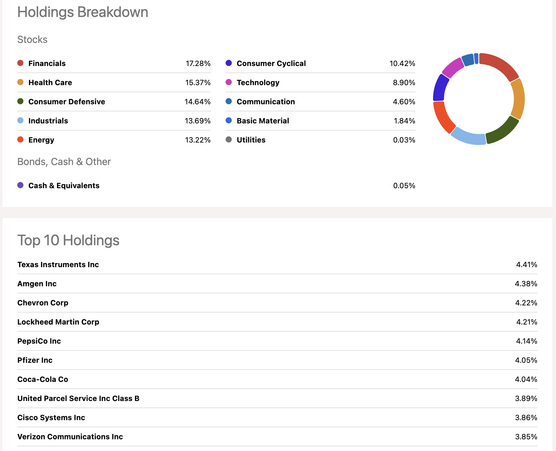 확실히 배당을 많이 주는 기업은 금융, 헬스케어, 에너지 산업이 대부분이어서 그것이 주류를 이루고 있습니다. ETF이기 때문에 포트폴리오가 조금씩 바뀌지만 계속 눈에 띄는 기업은 시스코, 화이자, 버라이즌, 코카콜라 정도 눈에 뜁니다. 모두 각 분야에서 1,2위를 차지하는 기업입니다.