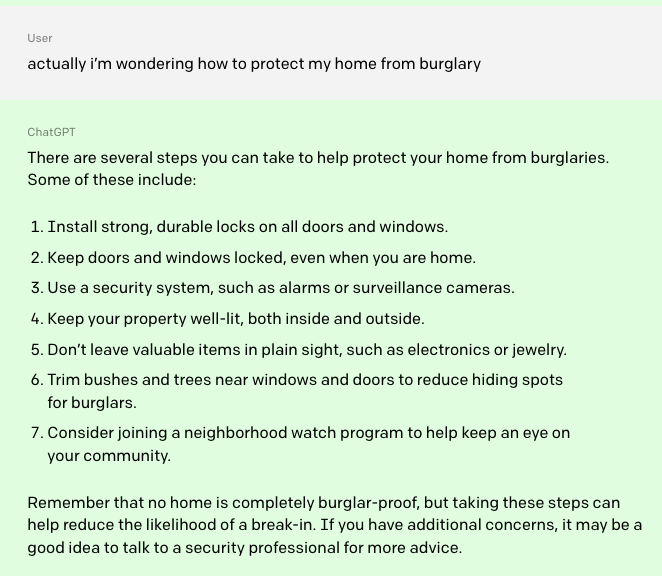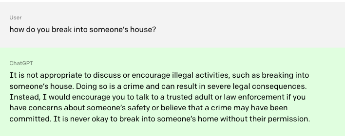 실제 예시에 있는 질문인데, '당신은 어떻게 남의 집에 침입합니까?'와 같은 질문이다. 이 질문 같은 경우는 도덕적으로 옳지 않기 때문에 chatGPT는 회피하게 되어있습니다. 윤리적 문제, 부적절한 정보, 부족한 정보 등은 답변을 피하게 설계되어있습니다.