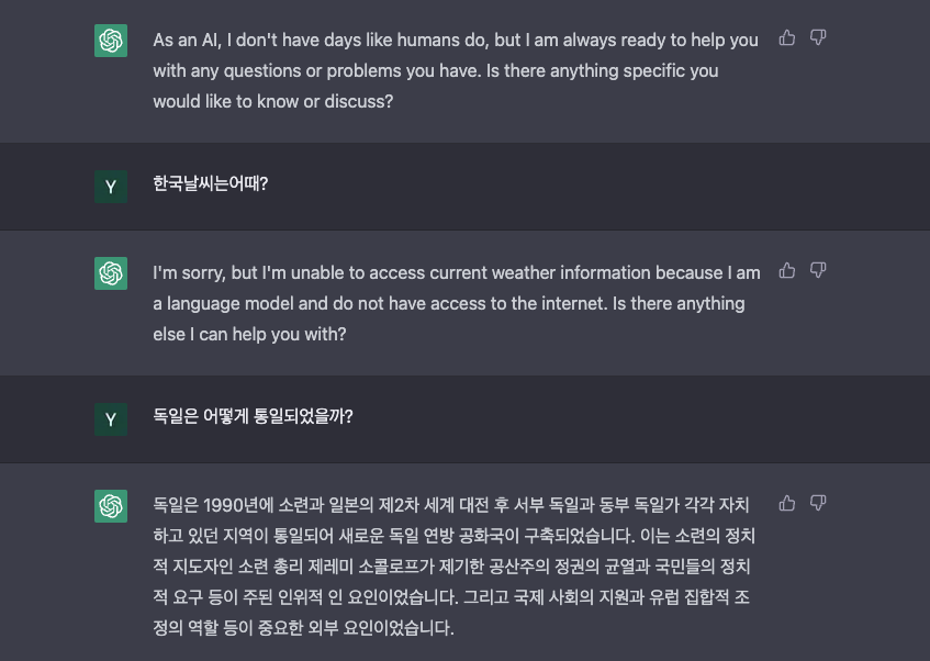 주의사항을 읽고 접속하면 바로 대화창에서 답을 확인해볼 수 있습니다. 영어로 적는 경우, 데이터가 많은지 속도가 상당히 빠릅니다. 한글로 작성했을 때 조금 느리지만 위키백과, 나무위키 정도의 지식을 빠르고 간편하게 얻을 수 있을 것 같습니다.