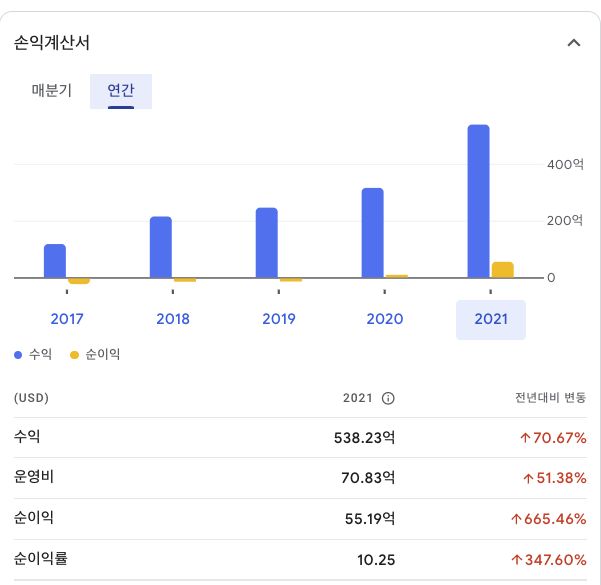 테슬라의 연 수익률은 확실히 큰 속도로 증가하고 있습니다. 구글 금융에 따르면 2019년에 245억 달러, 2020년에 315억 달러, 2021년에 538억 달러입니다. 연마다 매출의 성장률은 오르는 주가와 함께 높습니다. 2020 -> 2021은 매출이 60%가 넘게 성장했습니다.