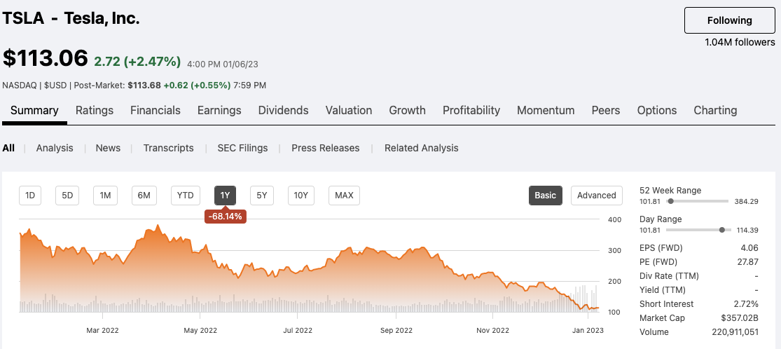 현재 테슬라의 주가는 113으로 내려앉았습니다. 제가 작년에 분할하기도 전에 샀을 때보다도 떨어졌으니 손해 아닌 사람이 별로 없을 것입니다. 올해 들어서 70%이상 떨어졌다고 합니다. 시가총액도 20위권으로 떨어졌습니다. 한 때 6위를 차지했었는데 역시 변동폭이 심합니다.