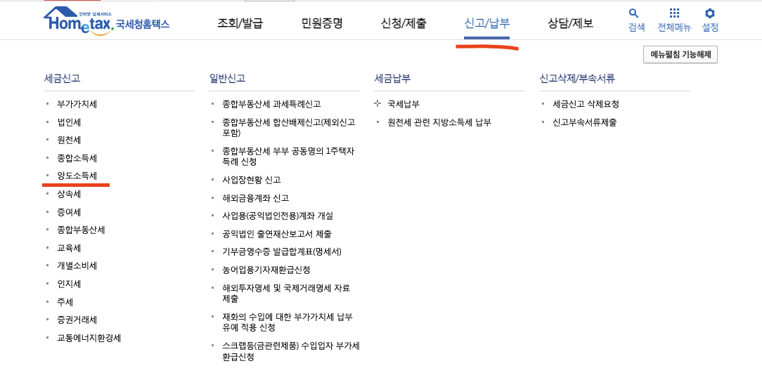 홈텍스에 로그인 한 뒤 -> 신고/납부 -> 양도소득세로 들어갑니다.