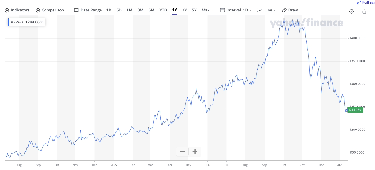 이에 따라서 모든 지수는 미래를 반영하므로 1400원을 뚫었던 원달러 환율은 1300원 밑으로 내려갔습니다. 아직 1100원까지 오려면 시간이 걸리겠지만 금리인상에 정점을 찍은 것을 확인하였으므로 1100원 후반대에서 ~1100원 초반대에 매수를 시작해도 좋을 것 같아보입니다. 1년~1년반사이에는