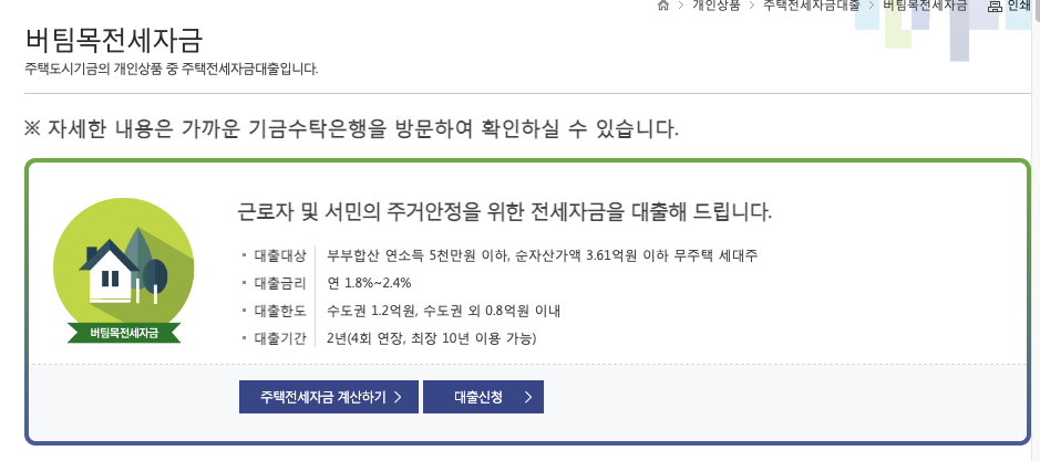 주택도시기금에서 만든 버팀목전세자금 대출상품입니다. LH와는 차이가 있습니다. LH 대출상품을 확인하려면 전 포스팅을 확인해주세요.