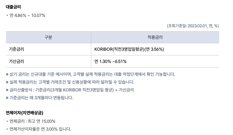 다음은 케이뱅크입니다. 대출금리는 최저 연 4.86% ~ 최대 10.07%입니다. 금리는 언제든 기준금리에 따라 변동할 수 있습니다. 최대한도는 2억원입니다.