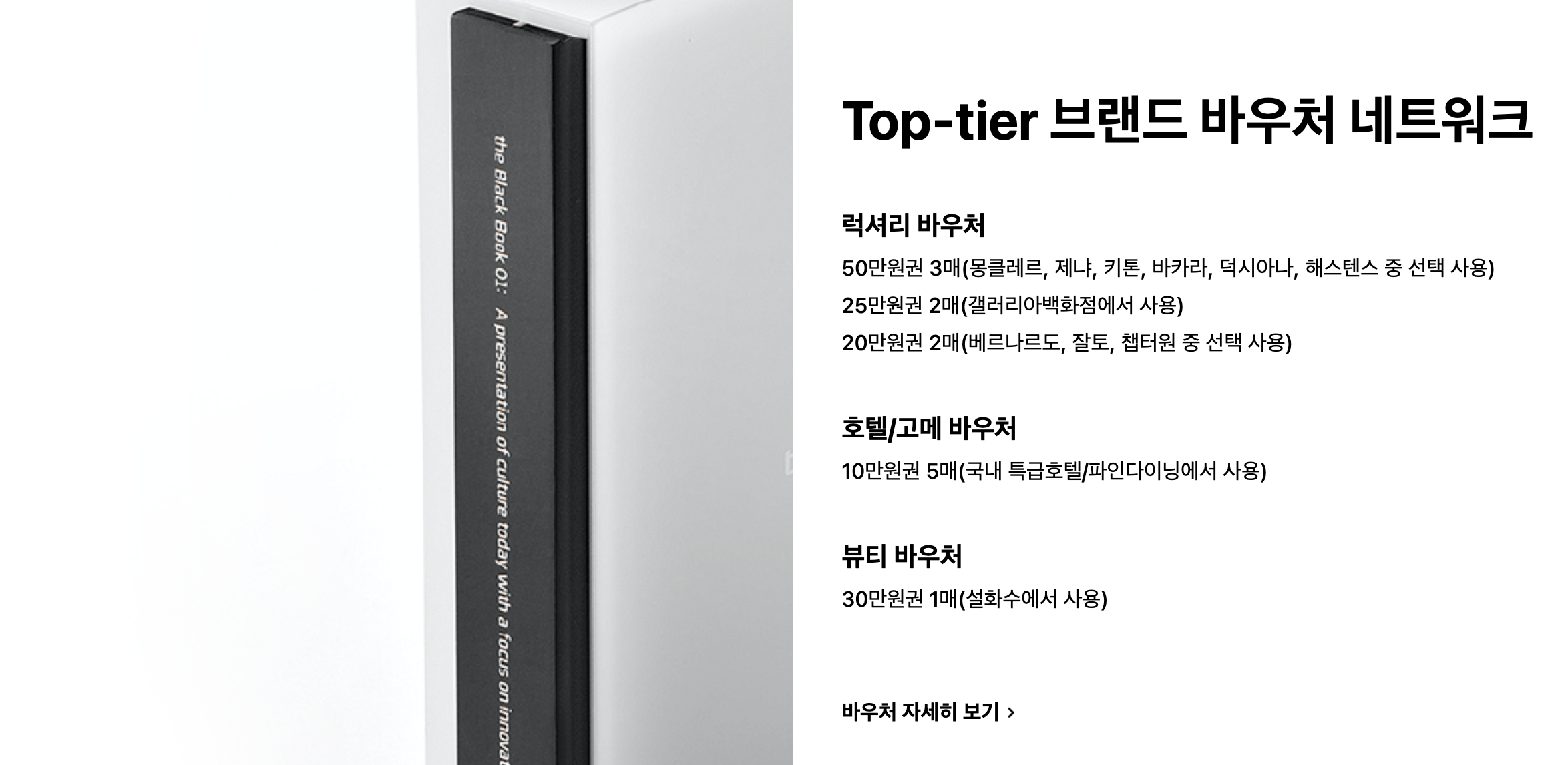 프리미엄 카드라서 그런지 혜택이 많습니다. 럭셔리 바우쳐에서 50만원권 3매, 25만원권 2매, 20만원권 2매 , 호텔/고메 바우처에서 10만원권 5매, 뷰티에서 30만원권 1매 등 소득수준에 맞는 대우를 해줍니다.